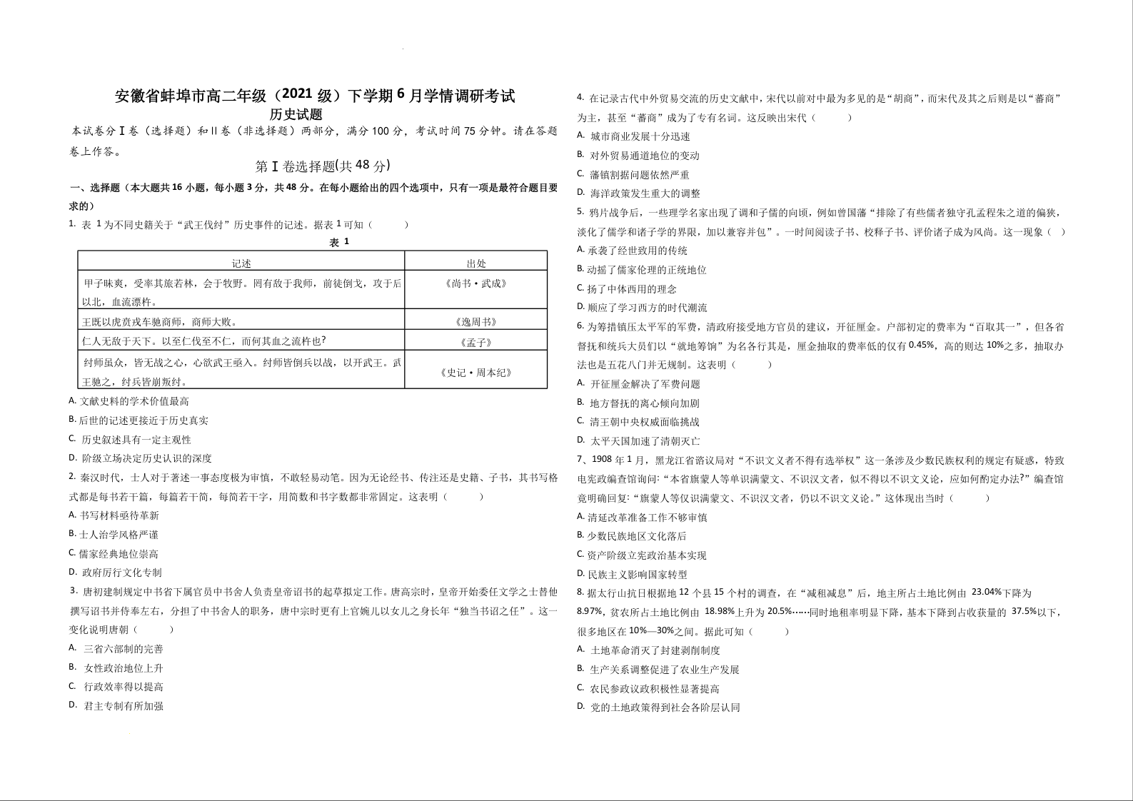 安徽省A10联盟2024届下学期6月学情调研考试历史