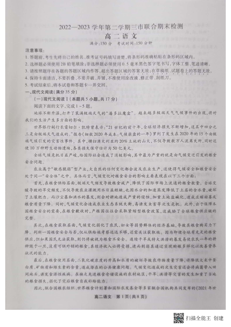 安徽省安庆、池州、铜陵三市2024届下学期联合期末检测语文