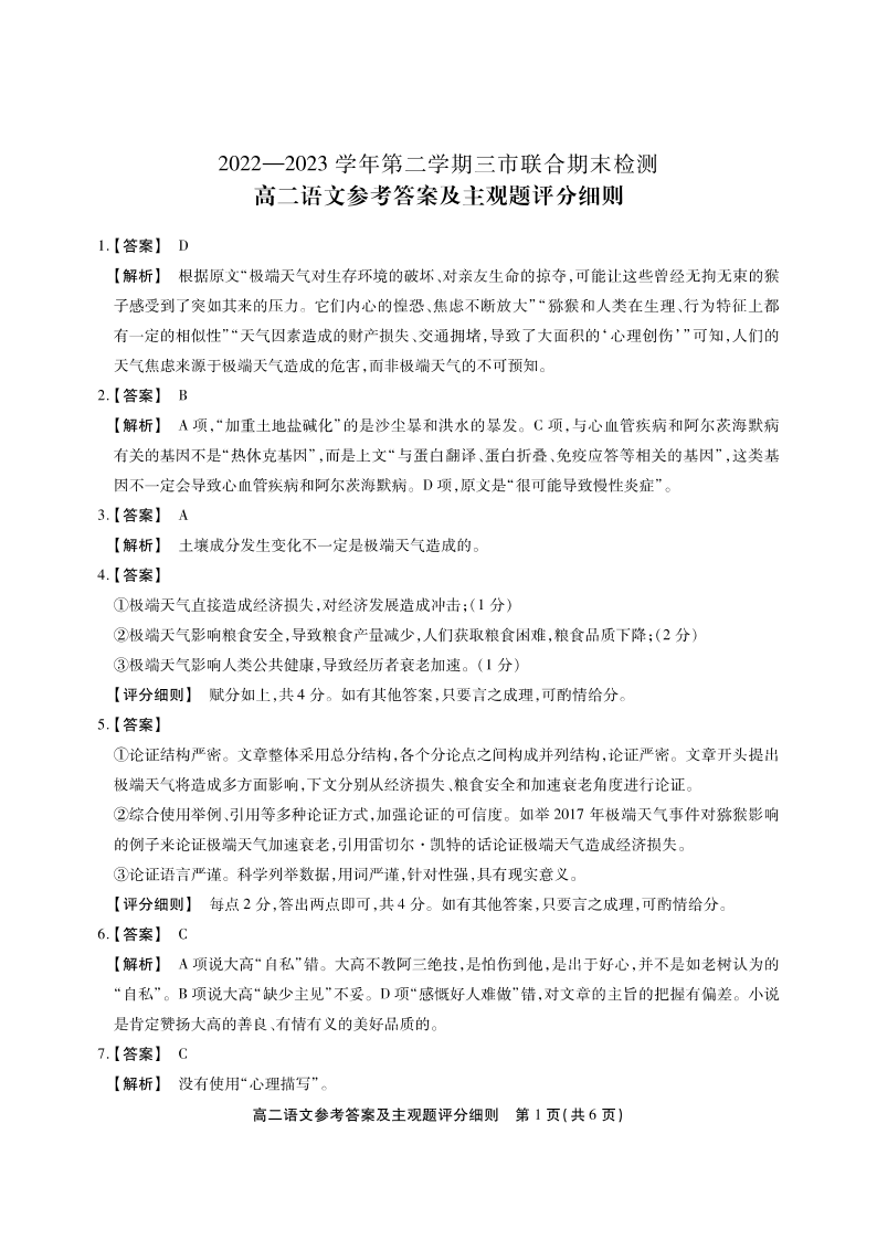 安徽省安庆、池州、铜陵三市2024届下学期联合期末检测语文答案