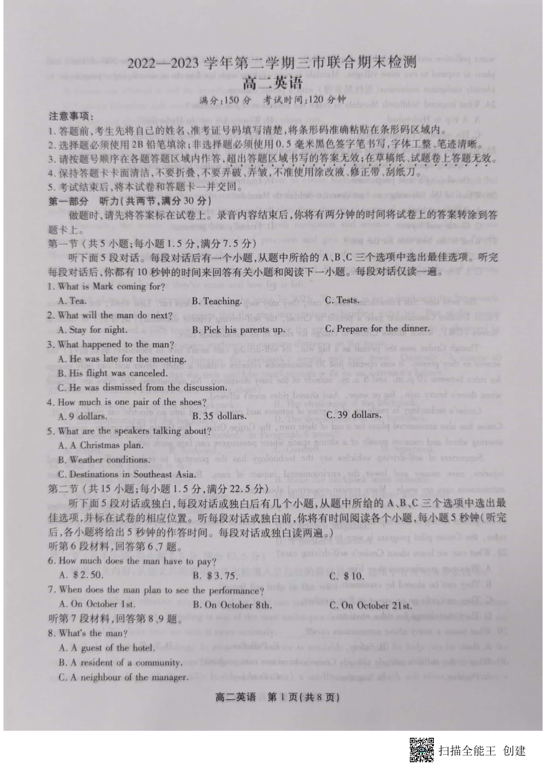 安徽省安庆、池州、铜陵三市2024届下学期联合期末检测英语