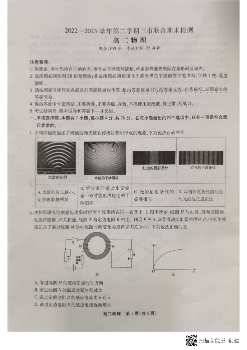 安徽省安庆、池州、铜陵三市2024届下学期联合期末检测物理