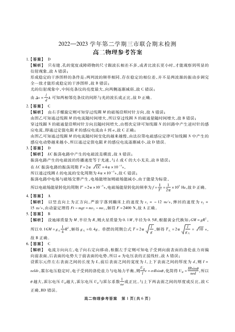 安徽省安庆、池州、铜陵三市2024届下学期联合期末检测物理答案