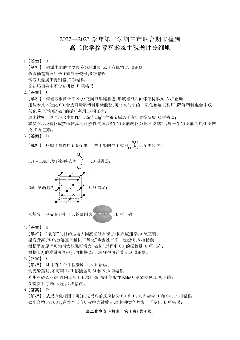 安徽省安庆、池州、铜陵三市2024届下学期联合期末检测化学答案