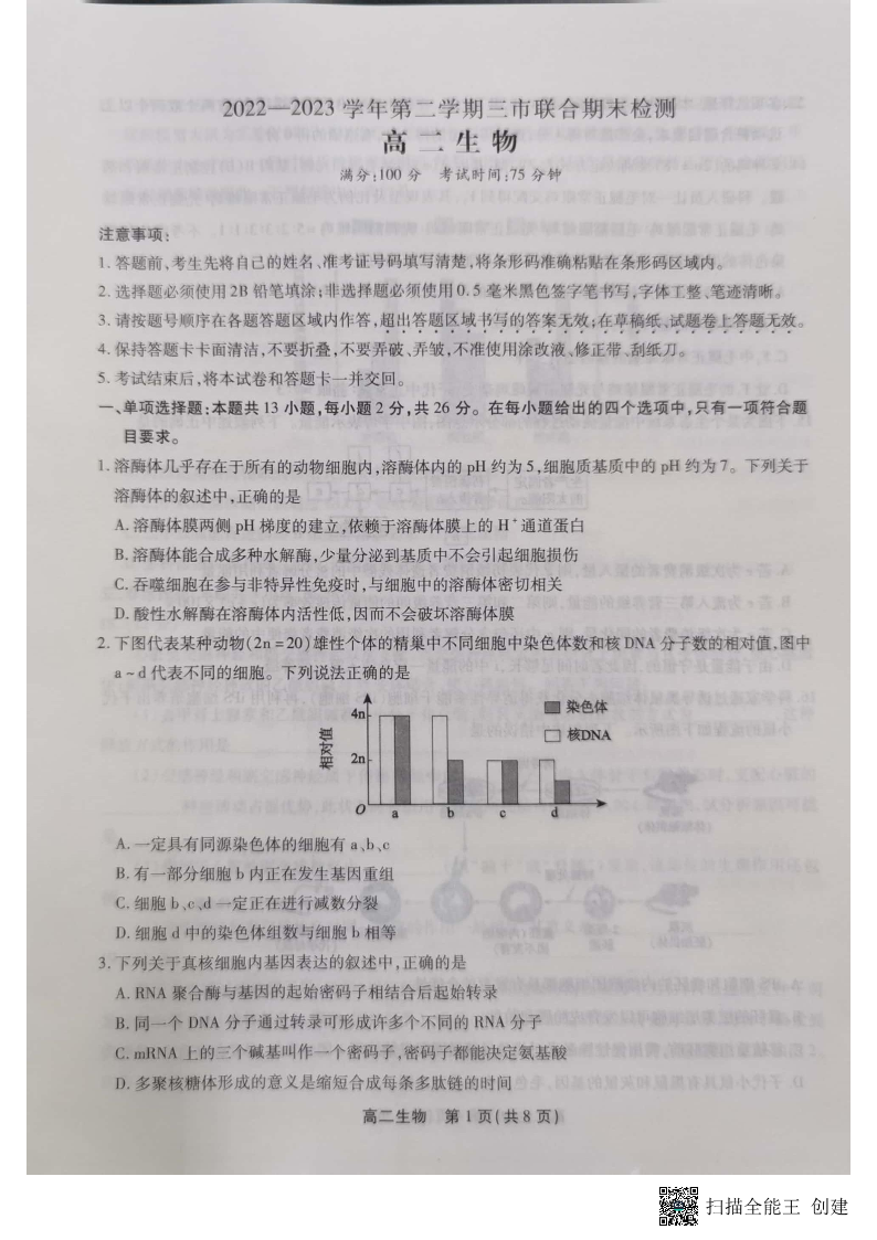 安徽省安庆、池州、铜陵三市2024届下学期联合期末检测生物
