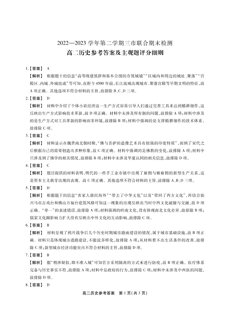 安徽省安庆、池州、铜陵三市2024届下学期联合期末检测历史答案