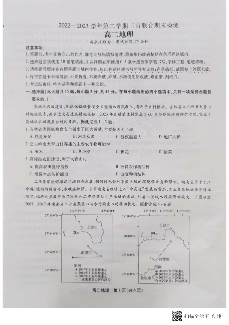 安徽省安庆、池州、铜陵三市2024届下学期联合期末检测地理