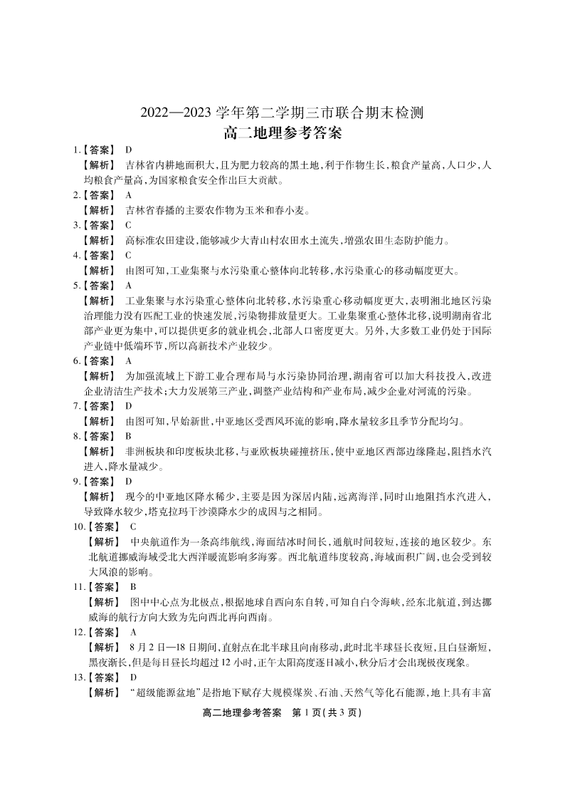 安徽省安庆、池州、铜陵三市2024届下学期联合期末检测地理答案