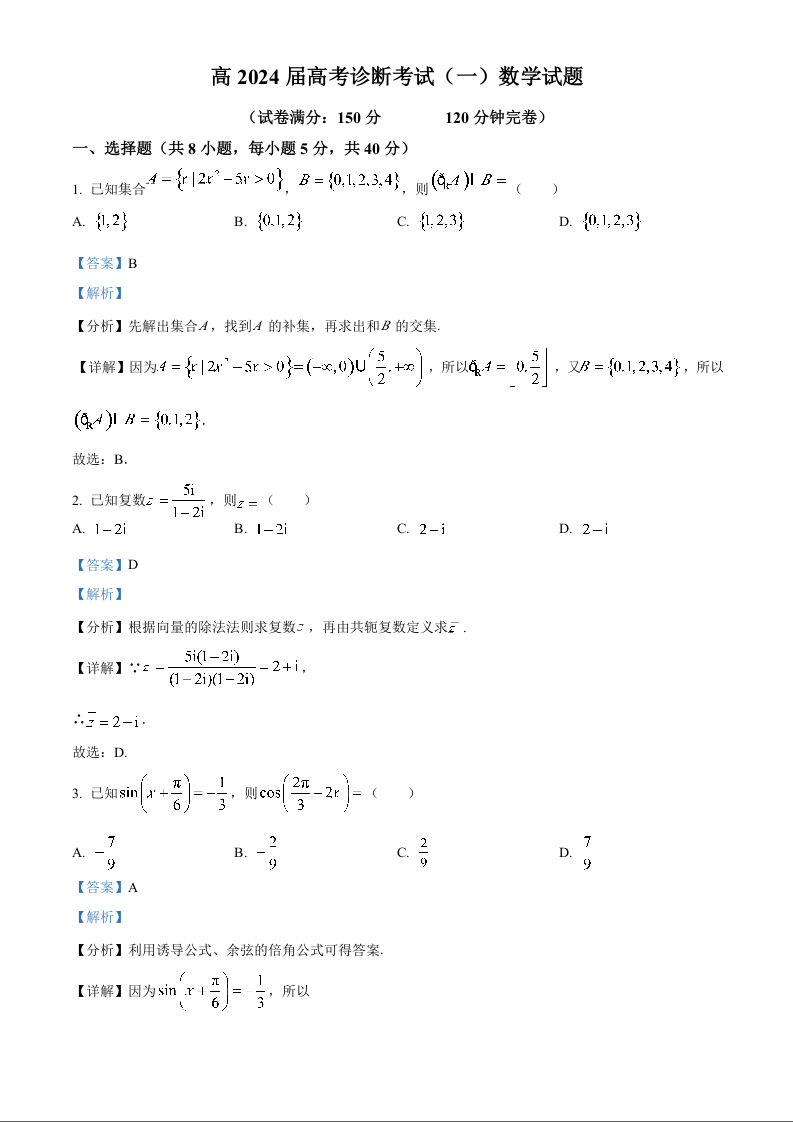重庆市巴南区2024届高三上学期诊断考试(一模)数学(解析版)