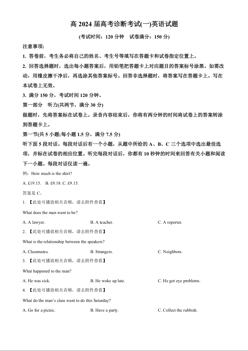 重庆市巴南区2024届高三上学期诊断考试(一模)英语(原卷版)