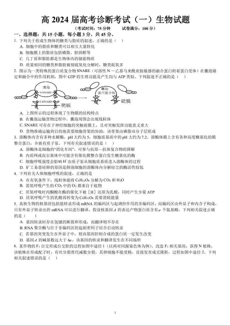 重庆市巴南区2024届高三上学期诊断考试(一模)生物+答案