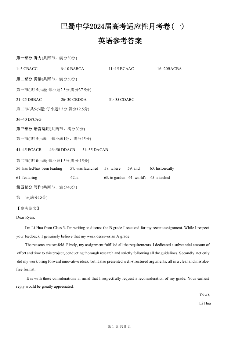 重庆市巴蜀中学2024届高考适应性月考卷(一)英语答案