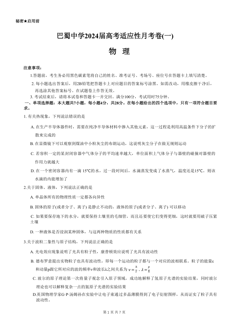 重庆市巴蜀中学2024届高考适应性月考卷(一)物理