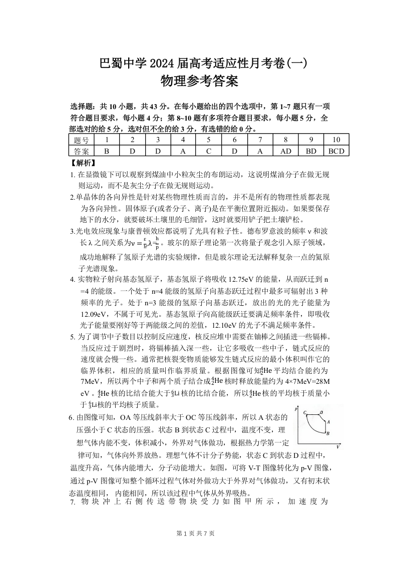 重庆市巴蜀中学2024届高考适应性月考卷(一)物理答案
