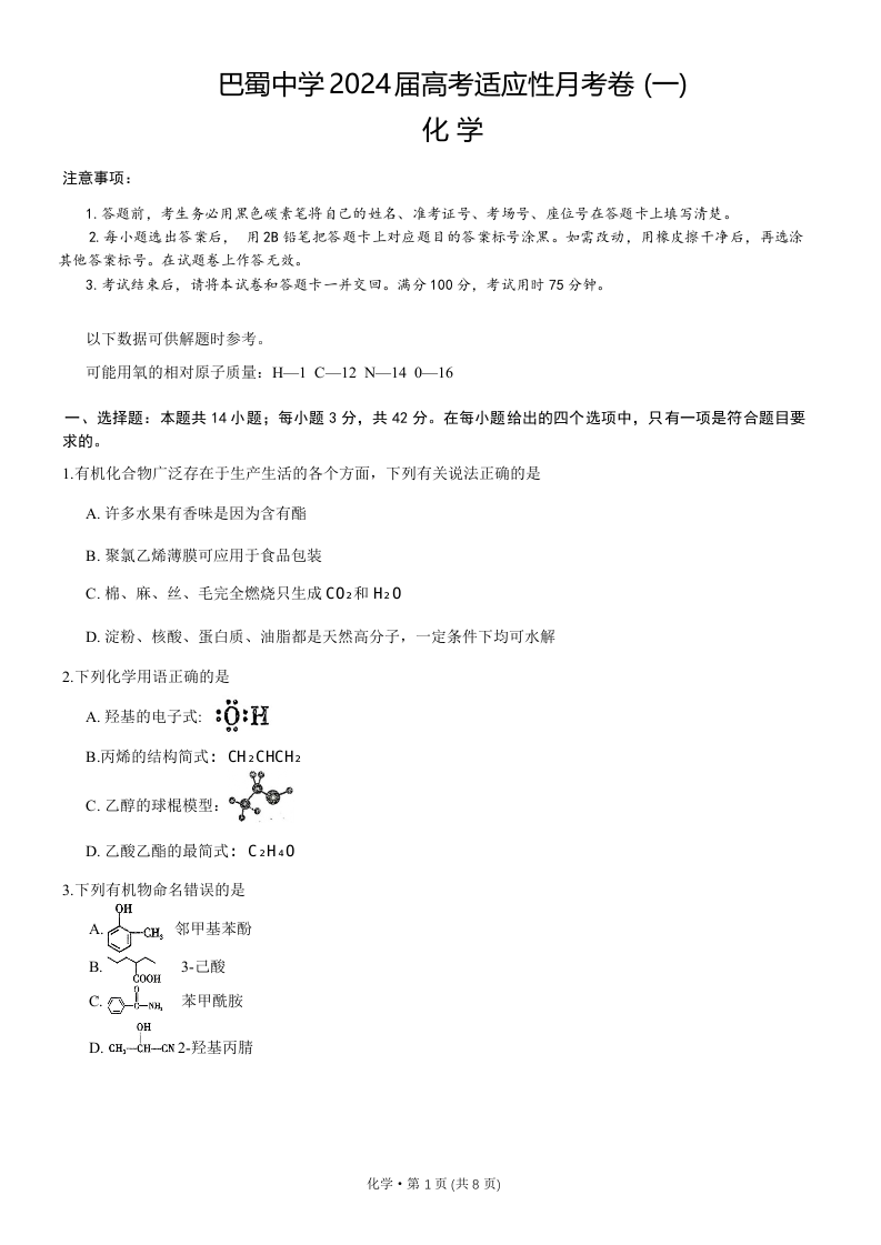 重庆市巴蜀中学2024届高考适应性月考卷(一)化学