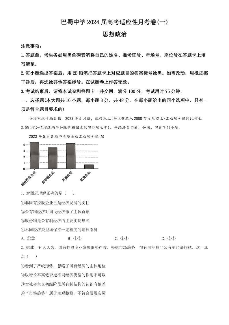 重庆市巴蜀中学2024届高考适应性月考卷(一)政治(精品解析版)
