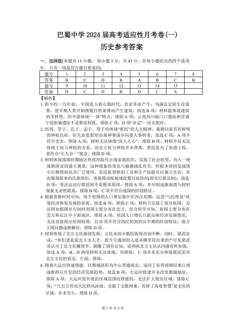 重庆市巴蜀中学2024届高考适应性月考卷(一)历史答案