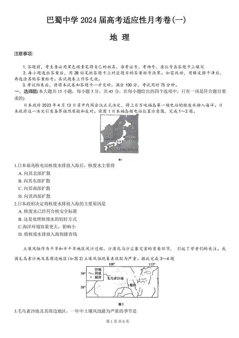 重庆市巴蜀中学2024届高考适应性月考卷(一)地理