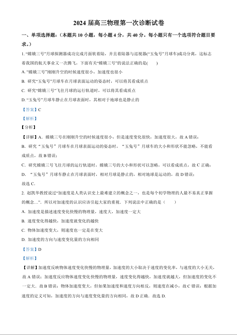 甘肃省武威市凉州区2024届高三上学期第一次诊断考试物理(精品解析版)