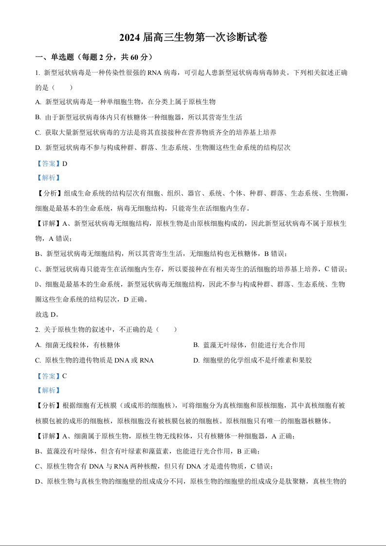甘肃省武威市凉州区2024届高三上学期第一次诊断考试生物(精品解析版)