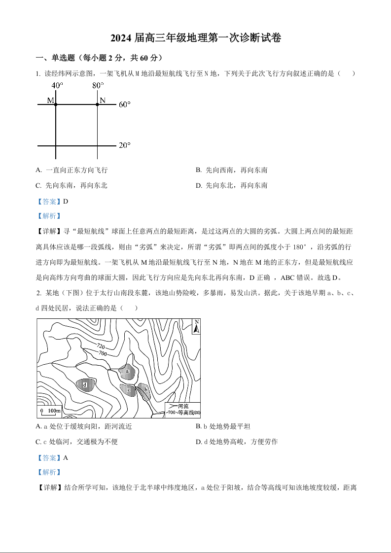 甘肃省武威市凉州区2024届高三上学期第一次诊断考试地理(精品解析版)