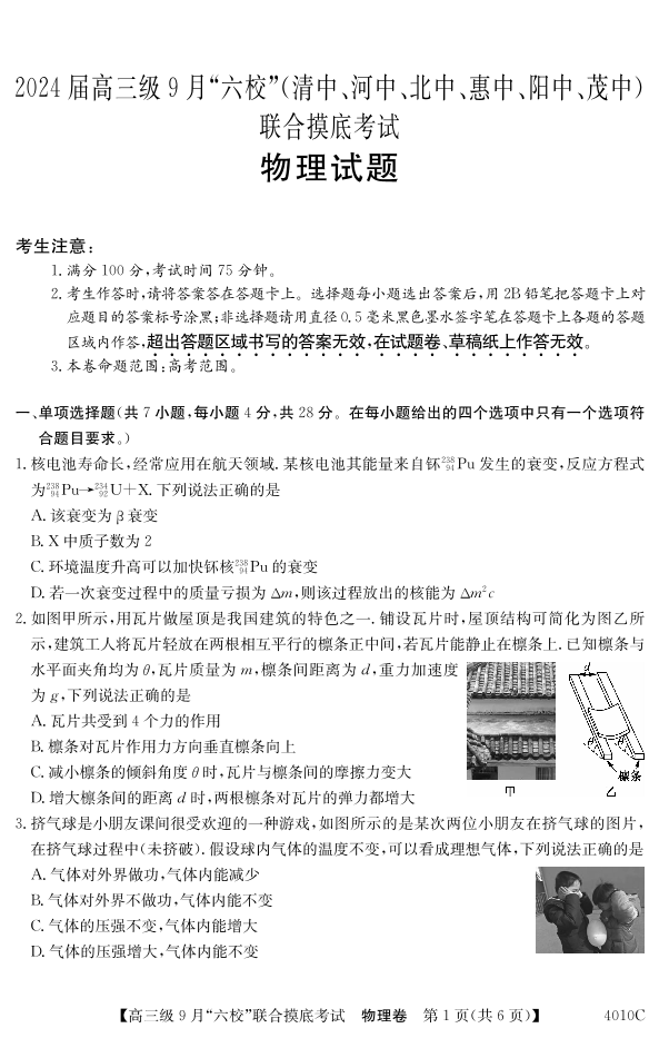 广东省六校(清中、河中、北中、惠中、阳中、茂中)2024届高三9月联考物理