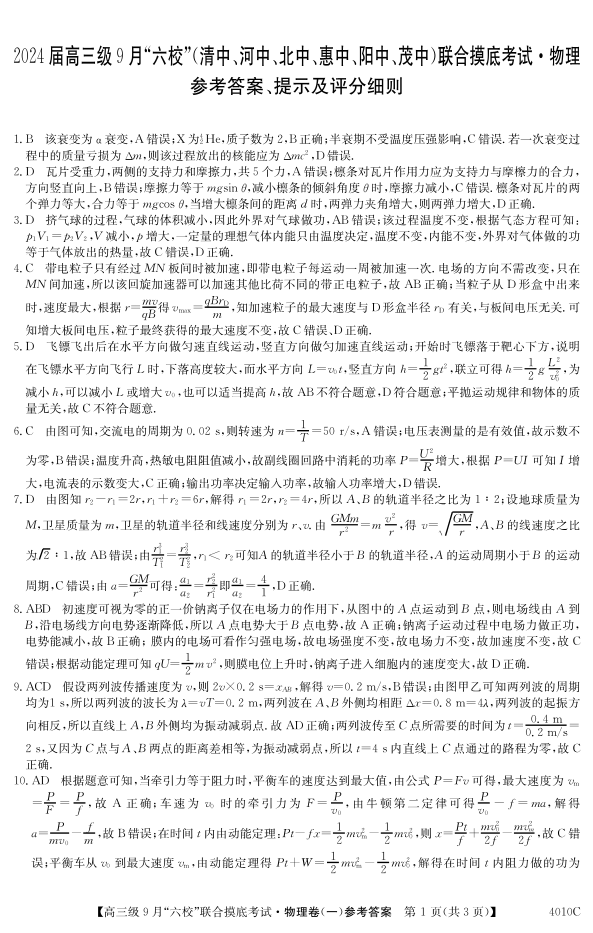 广东省六校(清中、河中、北中、惠中、阳中、茂中)2024届高三9月联考物理答案