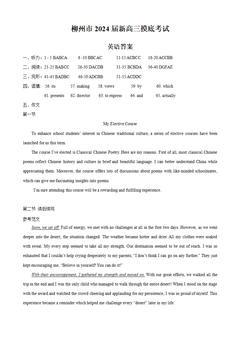 广西省柳州市2024届新高三上学期开学摸底考试英语答案