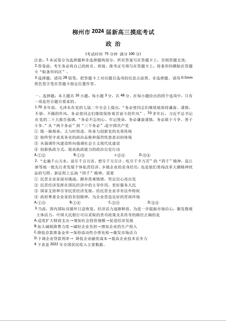 广西省柳州市2024届新高三上学期开学摸底考试政治