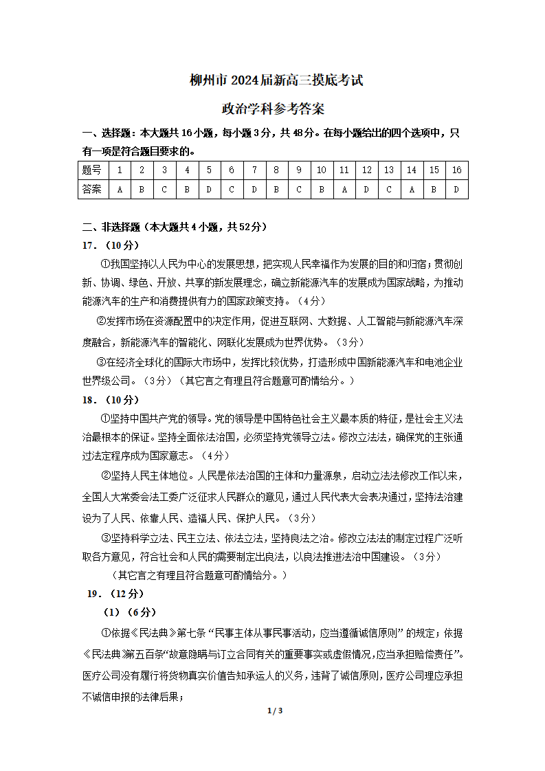 广西省柳州市2024届新高三上学期开学摸底考试政治答案