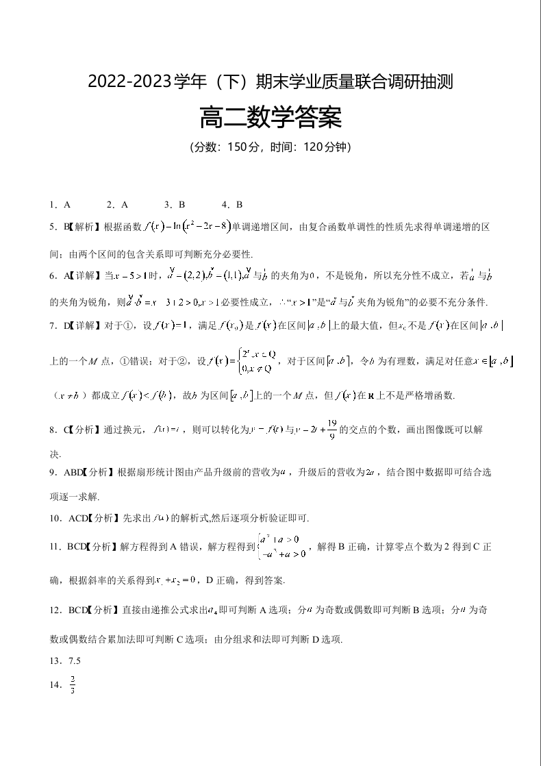 重庆市乌江新高考协作体2024届下学期期末数学答案