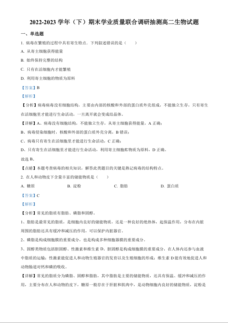 重庆市乌江新高考协作体2024届下学期期末生物(解析版)