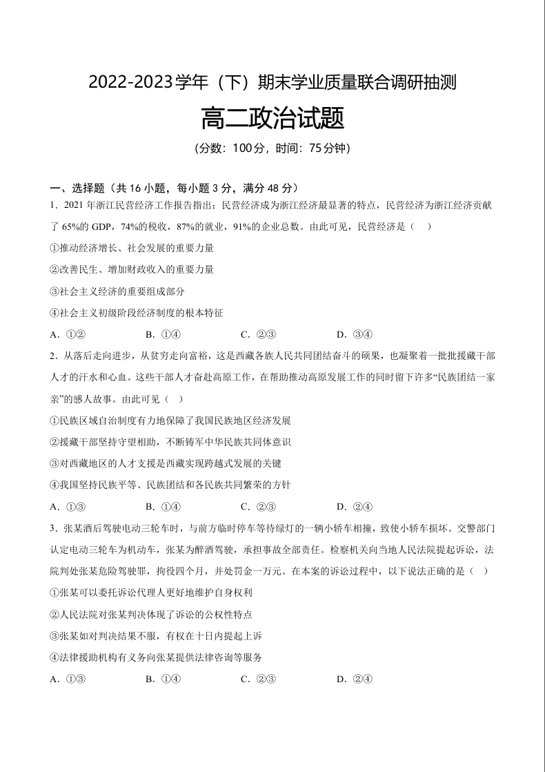 重庆市乌江新高考协作体2024届下学期期末政治