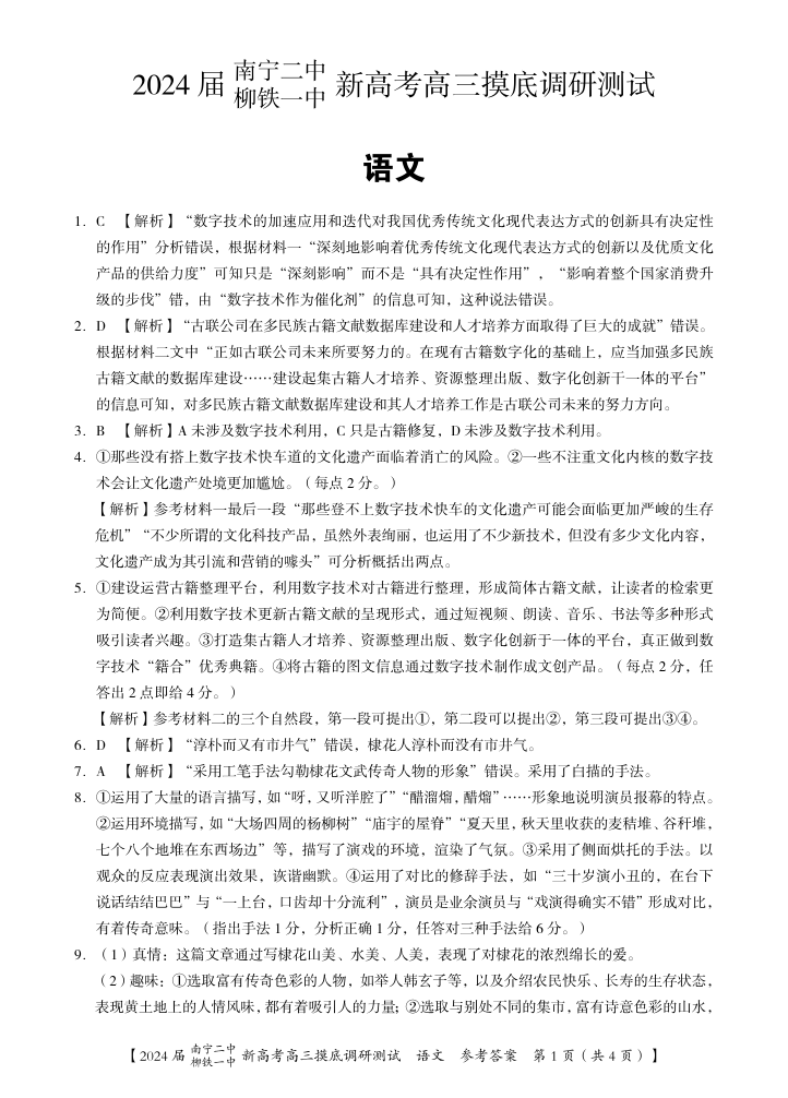 广西省南宁二中柳铁一中2024届新高考高三摸底考试语文答案