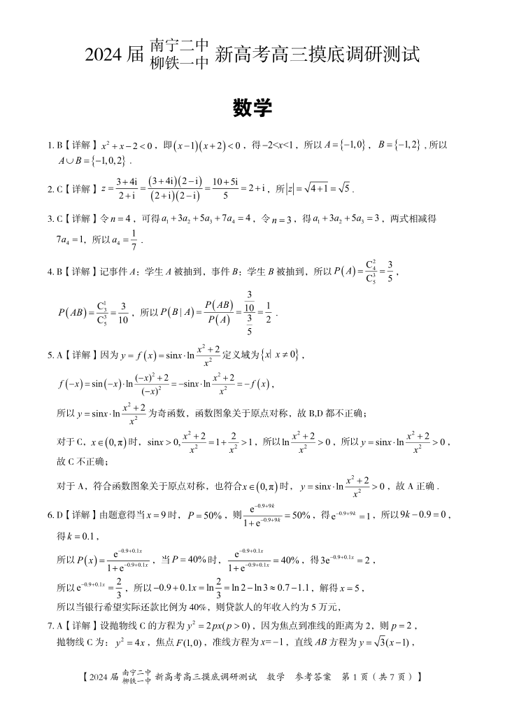 广西省南宁二中柳铁一中2024届新高考高三摸底考试数学答案