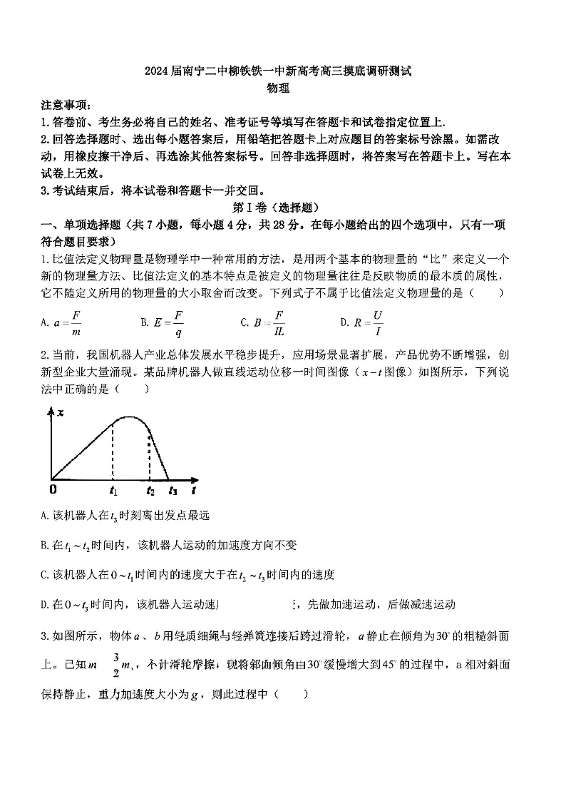 广西省南宁二中柳铁一中2024届新高考高三摸底考试物理+答案
