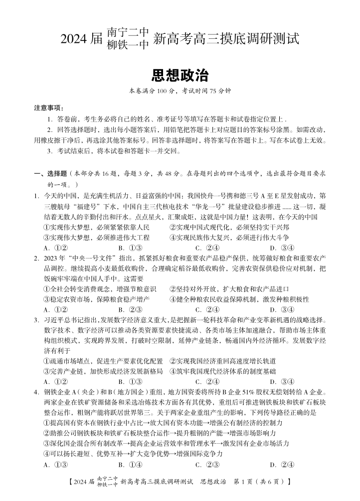 广西省南宁二中柳铁一中2024届新高考高三摸底考试政治