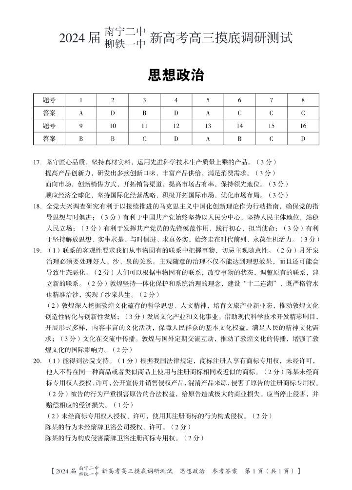 广西省南宁二中柳铁一中2024届新高考高三摸底考试政治答案