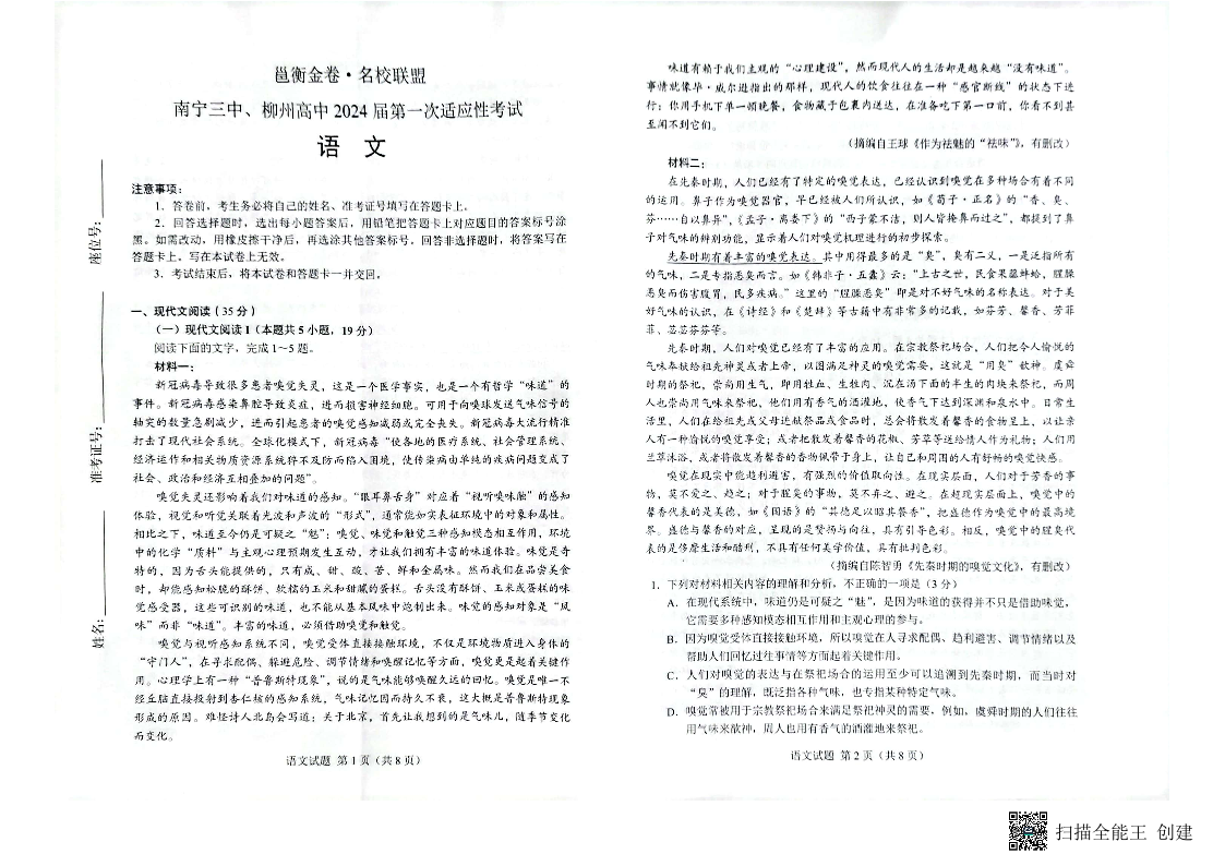 广西省南宁三中柳州高中2024届第一次适应性考试语文