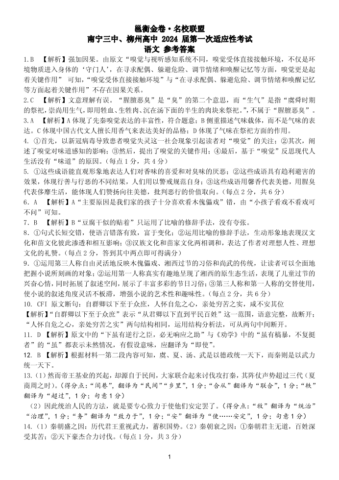 广西省南宁三中柳州高中2024届第一次适应性考试语文答案