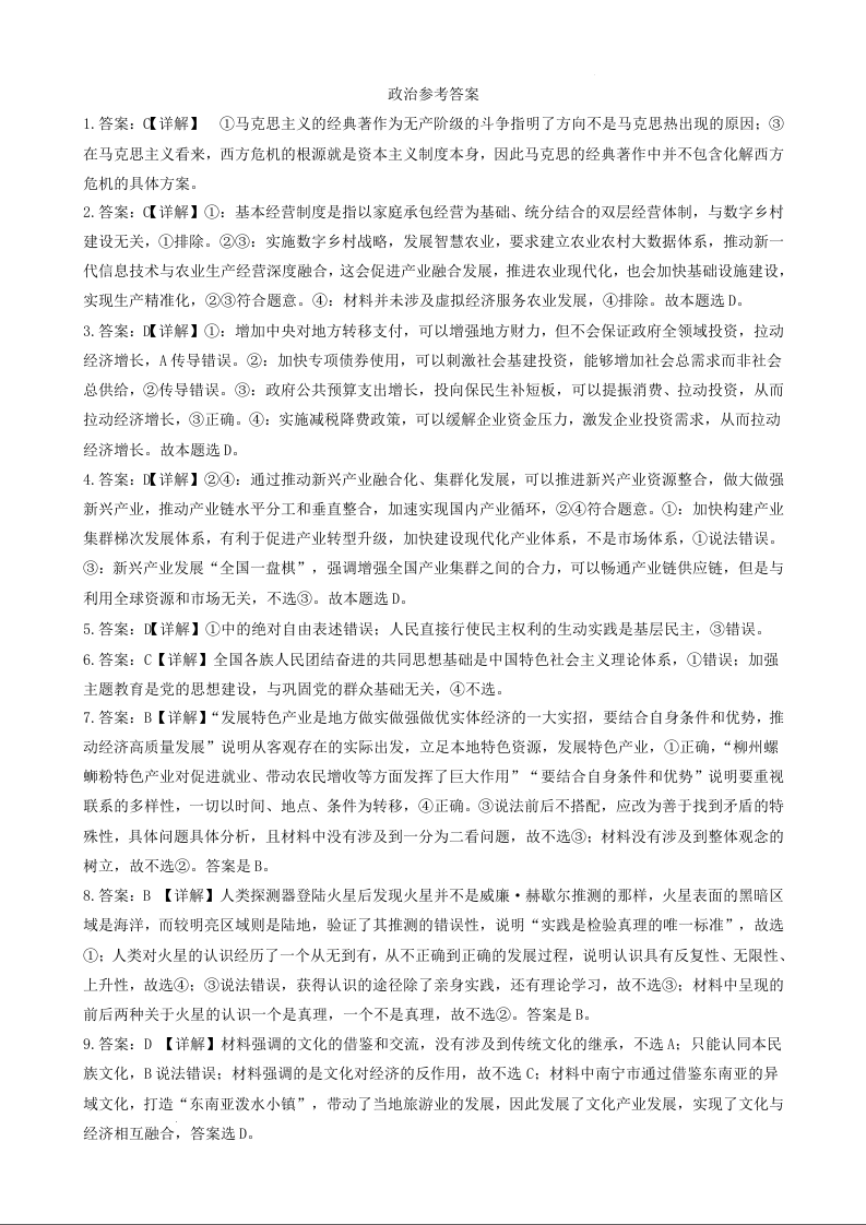 广西省南宁三中柳州高中2024届第一次适应性考试政治答案