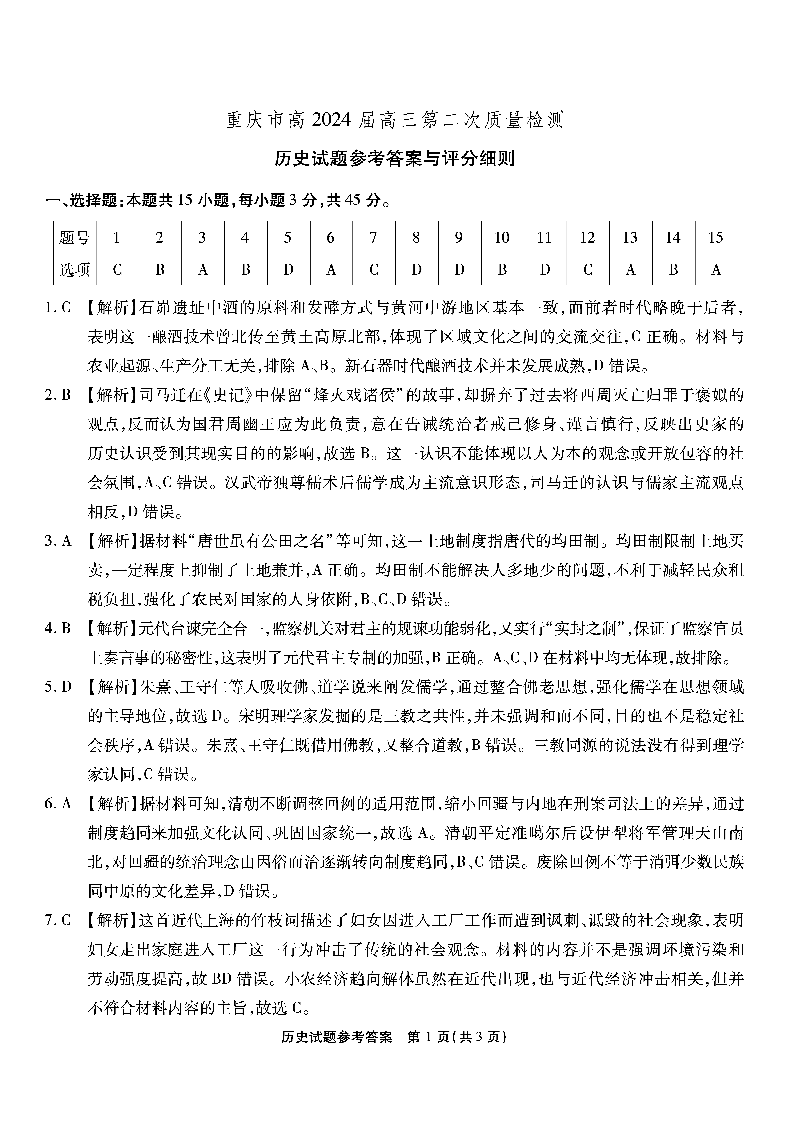 重庆市南开中学高2024届高三质量检测(二)历史答案