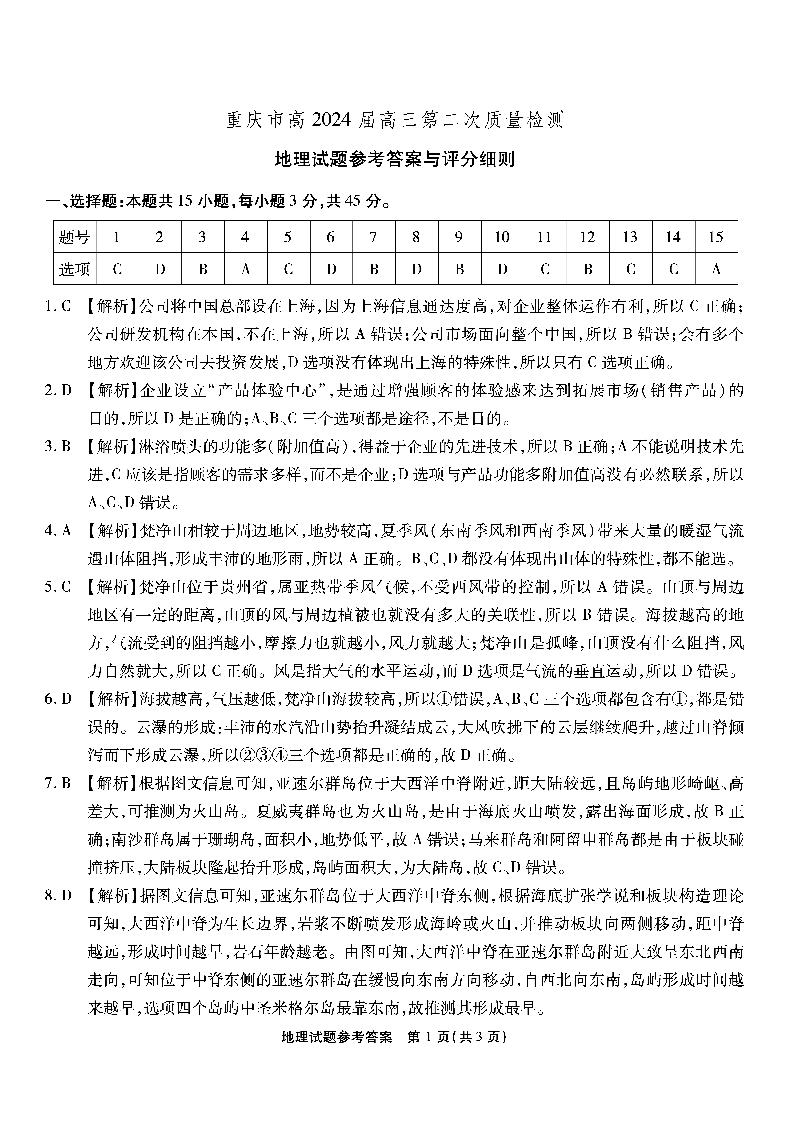 重庆市南开中学高2024届高三质量检测(二)地理答案