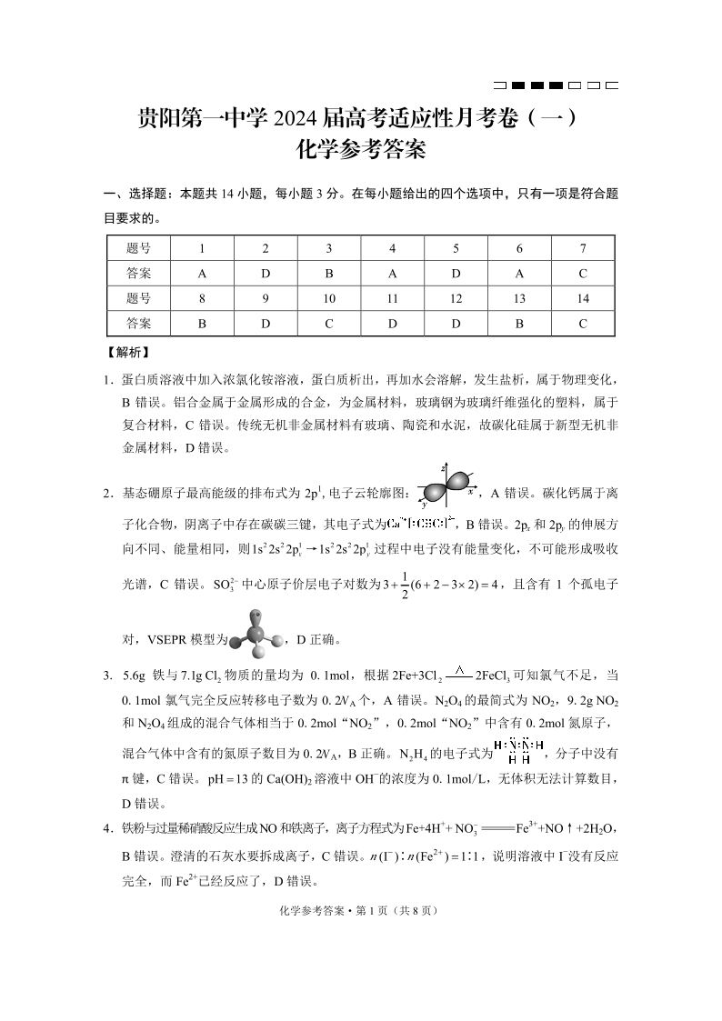 贵州省贵阳市第一中学2024届高考适应性月考(一)化学答案