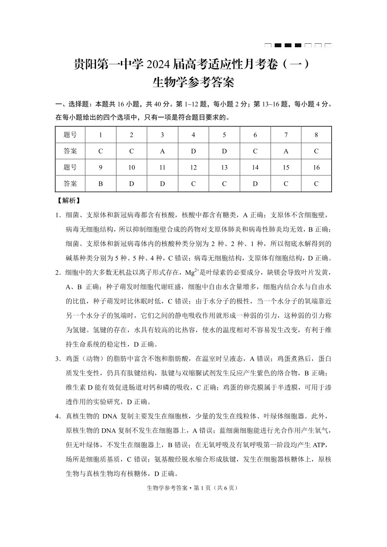 贵州省贵阳市第一中学2024届高考适应性月考(一)生物答案
