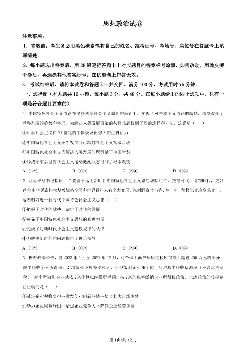 贵州省贵阳市第一中学2024届高考适应性月考(一)政治