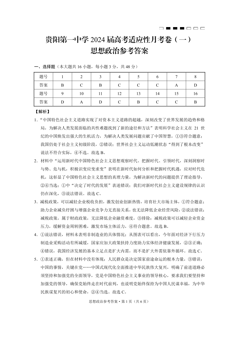 贵州省贵阳市第一中学2024届高考适应性月考(一)政治答案