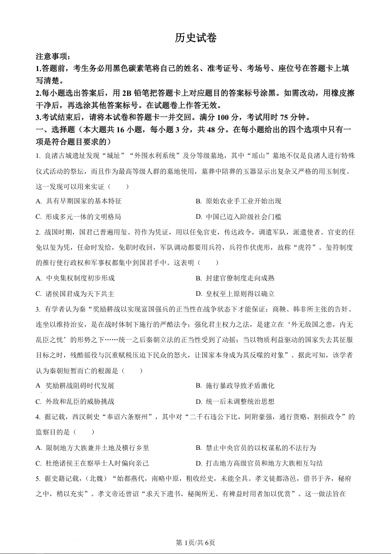 贵州省贵阳市第一中学2024届高考适应性月考(一)历史(原卷版)