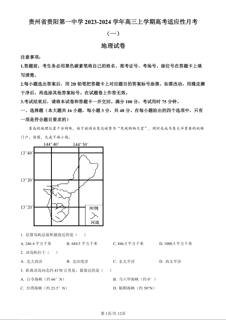 贵州省贵阳市第一中学2024届高考适应性月考(一)地理(精品解析版)