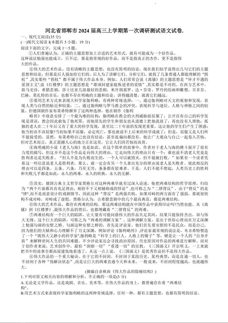 河北省邯郸市2024届高三上学期第一次调研监测语文+答案