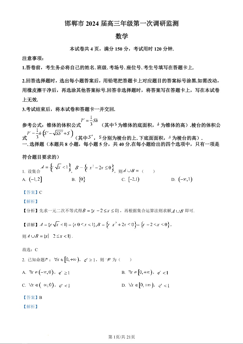 河北省邯郸市2024届高三上学期第一次调研监测数学(精品解析版)